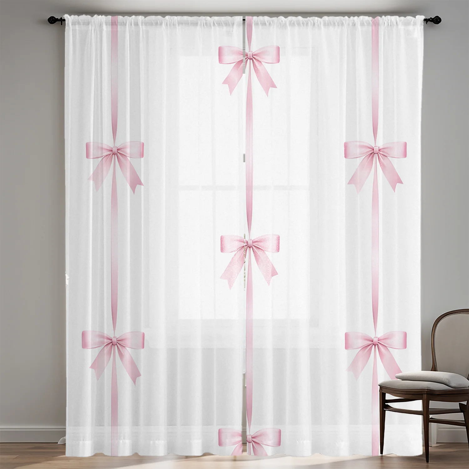 2PC Pink Bow Sheer Curtains – HD Digital Print, Pocket Rod Design for Living Room & Bedroom – Home Decor Window Treatments